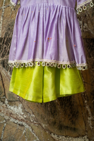 Effortlessly chic—lilac chanderi peplum sprinkled with sequins, paired with lime silk flared pants for a fresh festive statement.