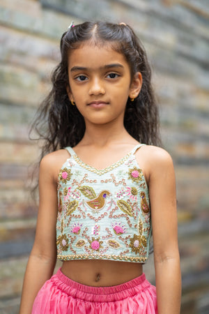 • Craft: Mint silk blouse; peach organza garara
