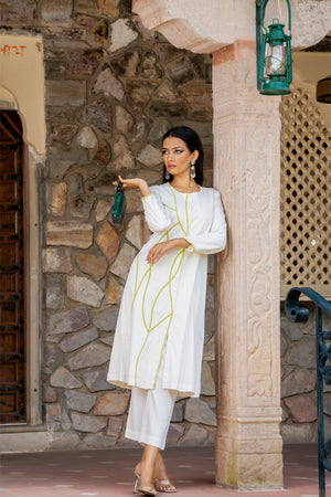 An asymmetrical kurta in supple cotton silk featuring Aanchkala appliqué; a quiet statement with impeccable drape.