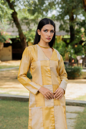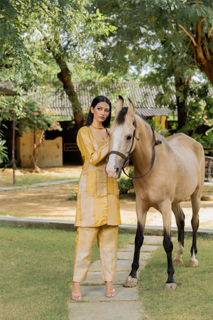 A luminous tissue co‑ord with liquid sheen and soft structure—effortlessly dressy with minimal accessories.