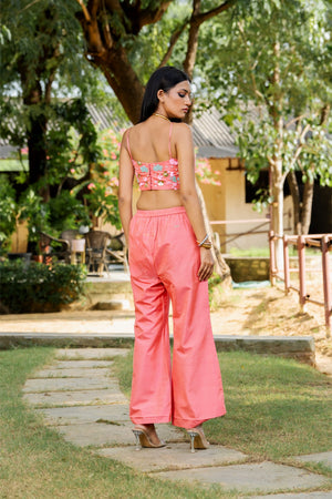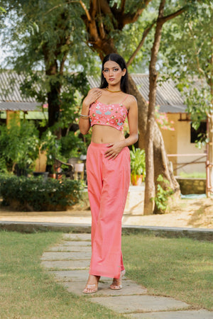 Hand‑embroidered sitara work illuminates a sculpted silk crop‑top—pair with high‑waist trousers or a skirt for evening glamour.
