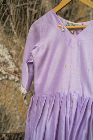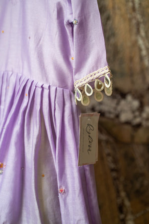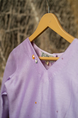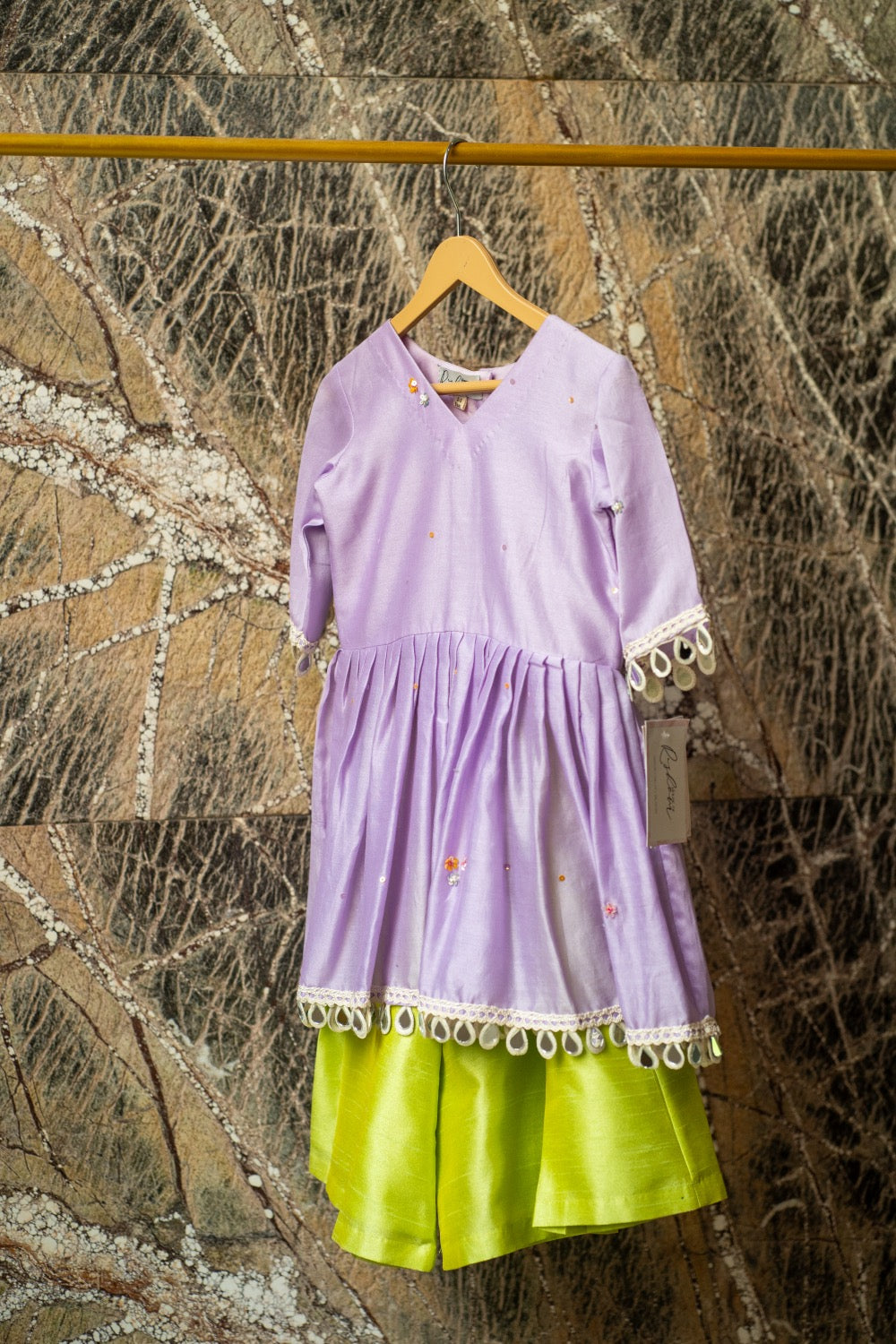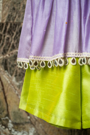 Effortlessly chic—lilac chanderi peplum sprinkled with sequins, paired with lime silk flared pants for a fresh festive statement.