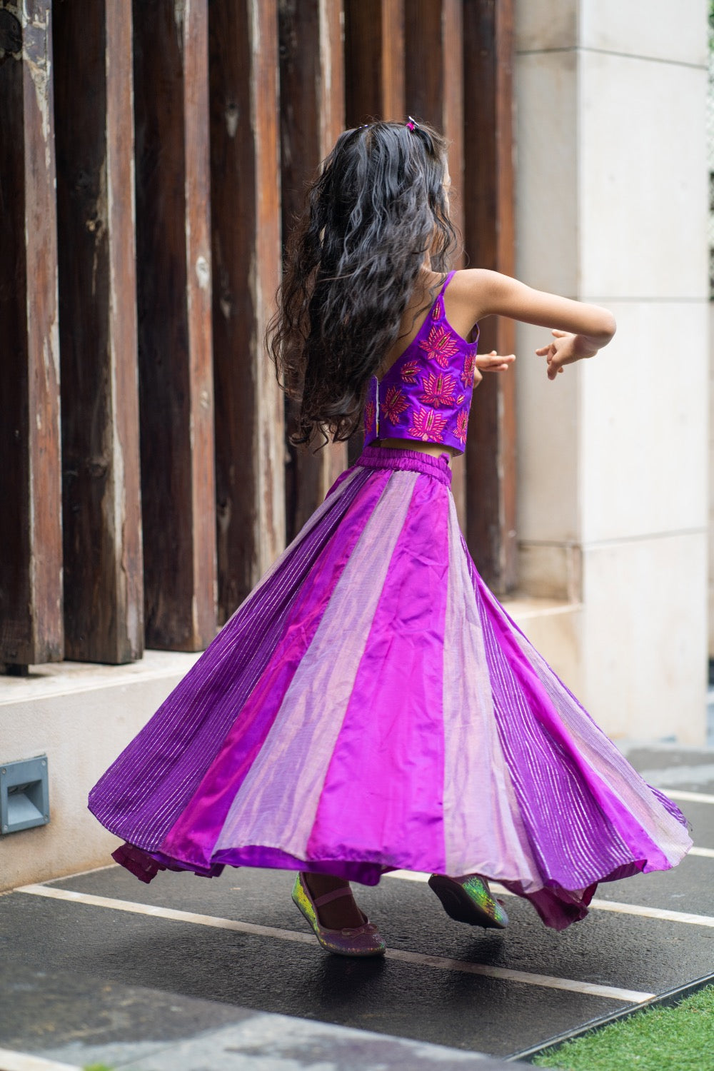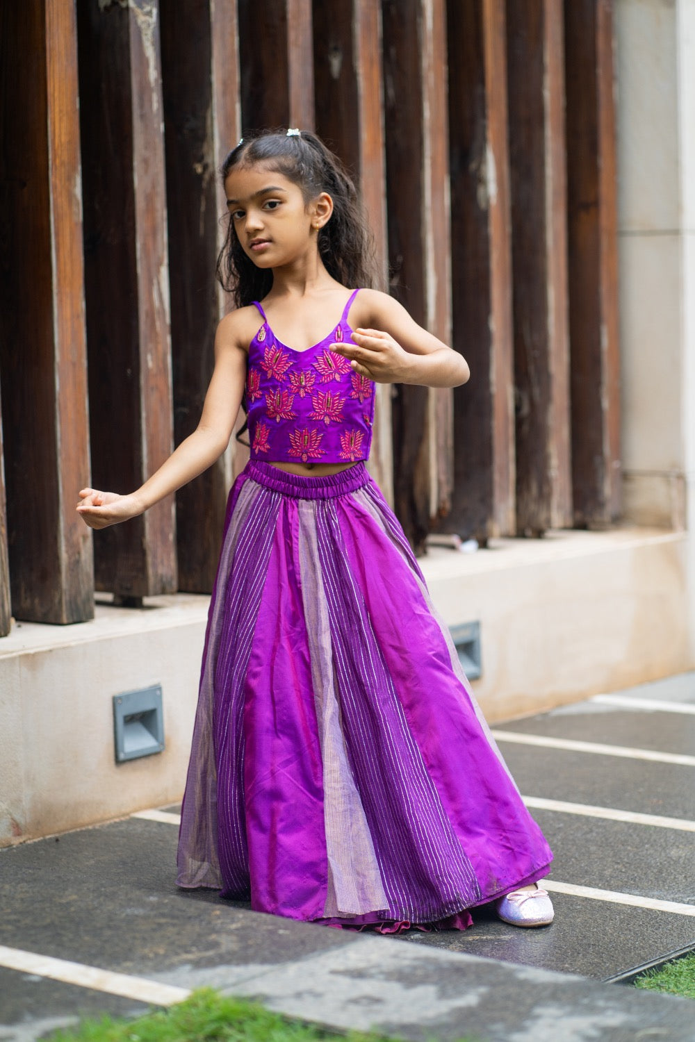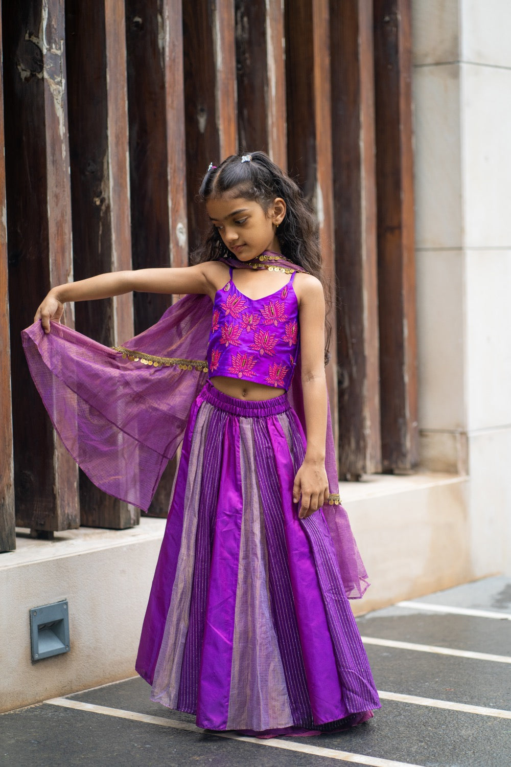 A standout lehenga composed in shades of purple with a hand‑embroidered silk blouse—rich textures, regal palette.