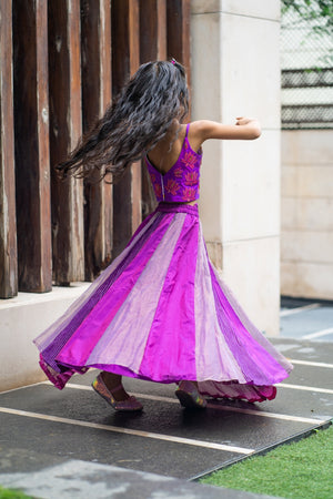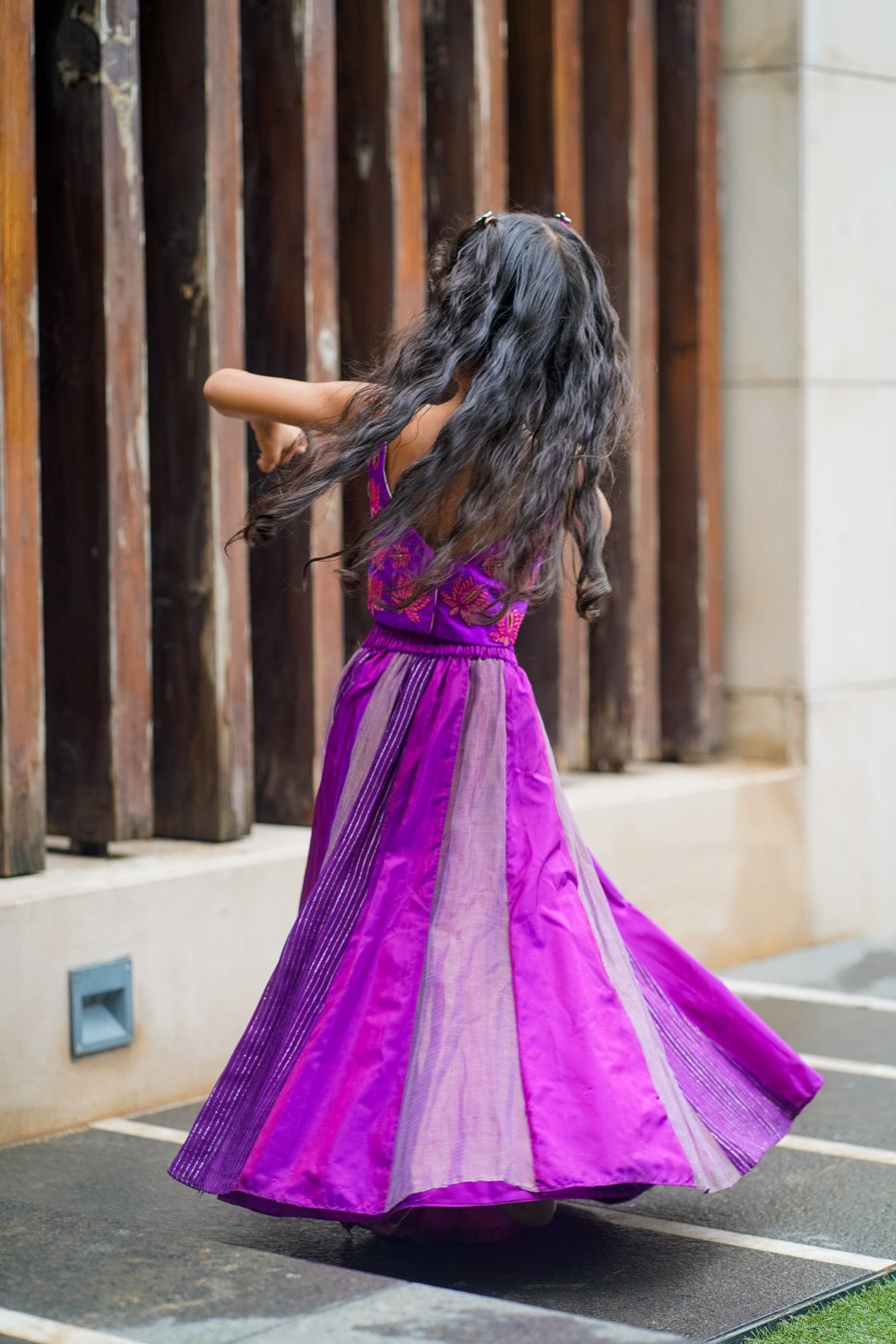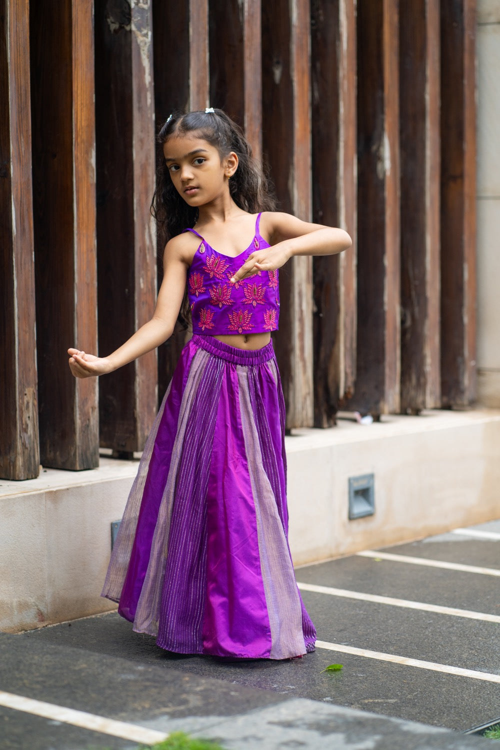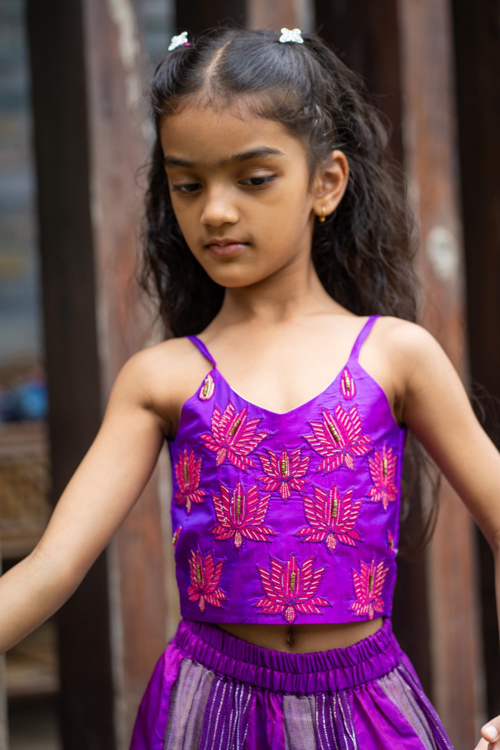 A standout lehenga composed in shades of purple with a hand‑embroidered silk blouse—rich textures, regal palette.