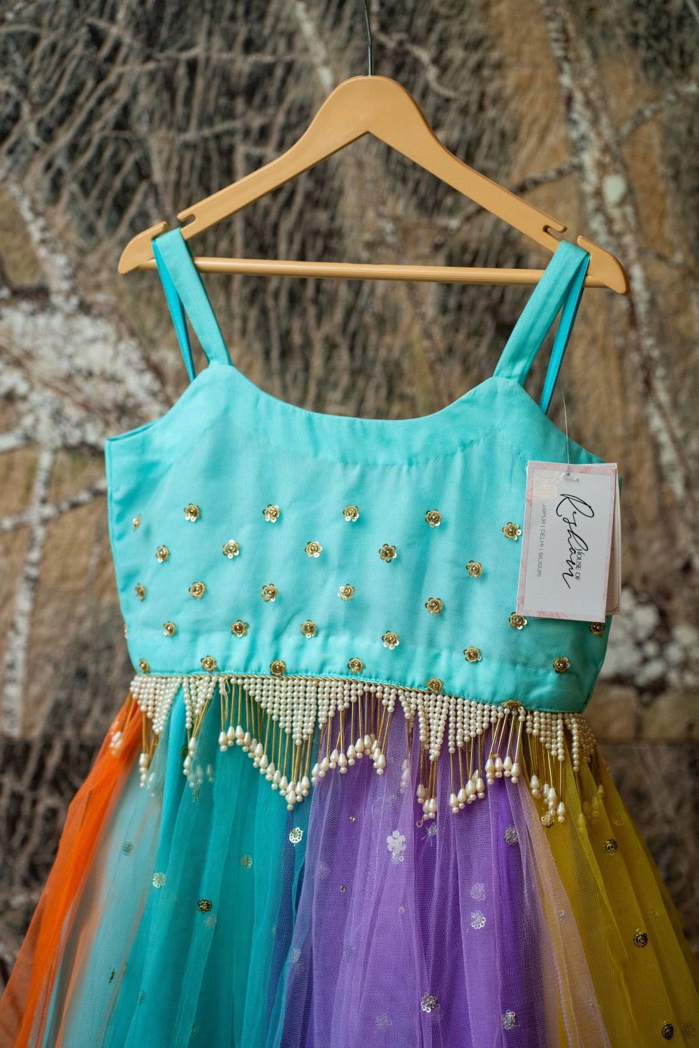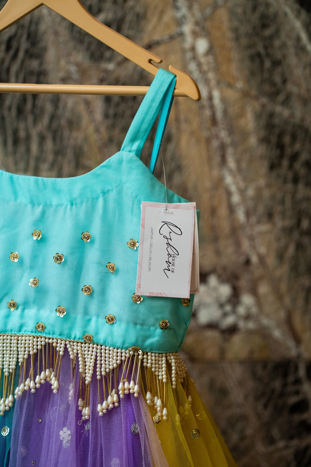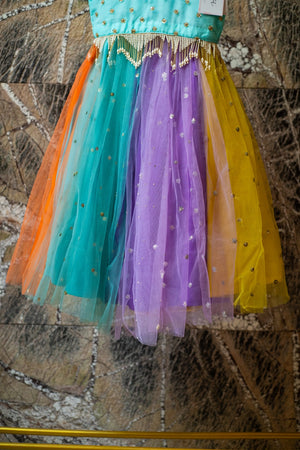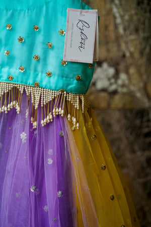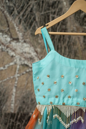 A luminous net skirt paired with a delicately hand‑embroidered blouse—romantic textures and refined sparkle for special occasions.