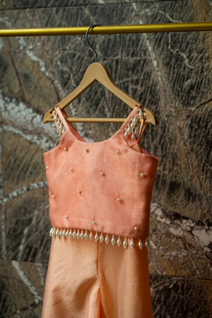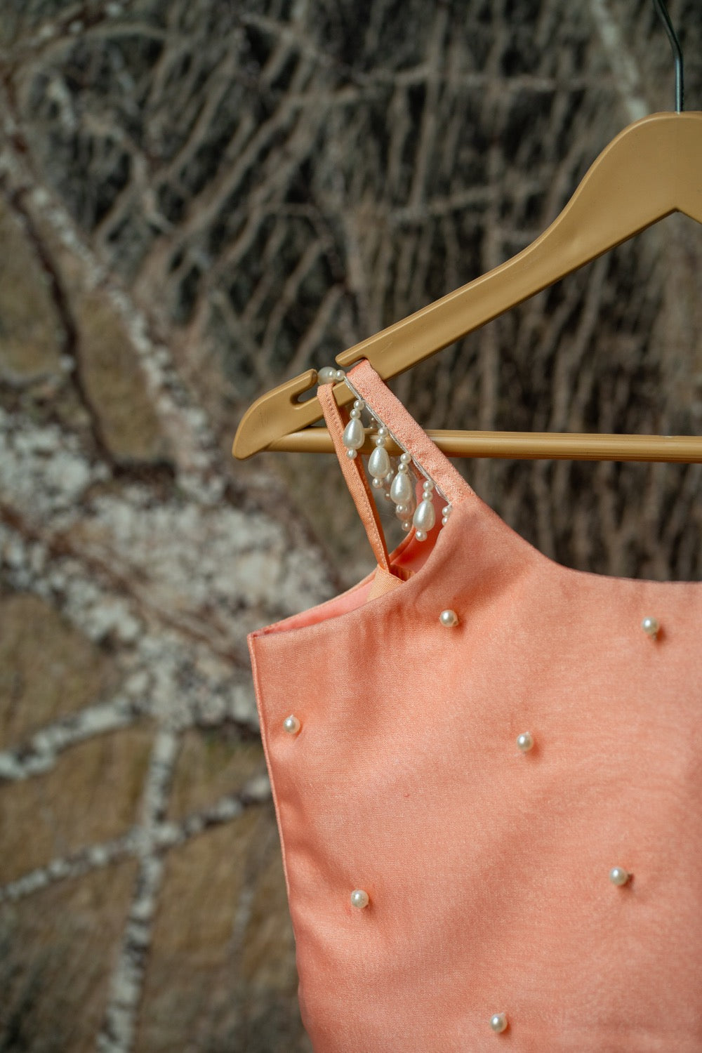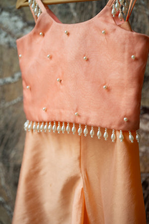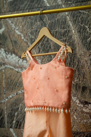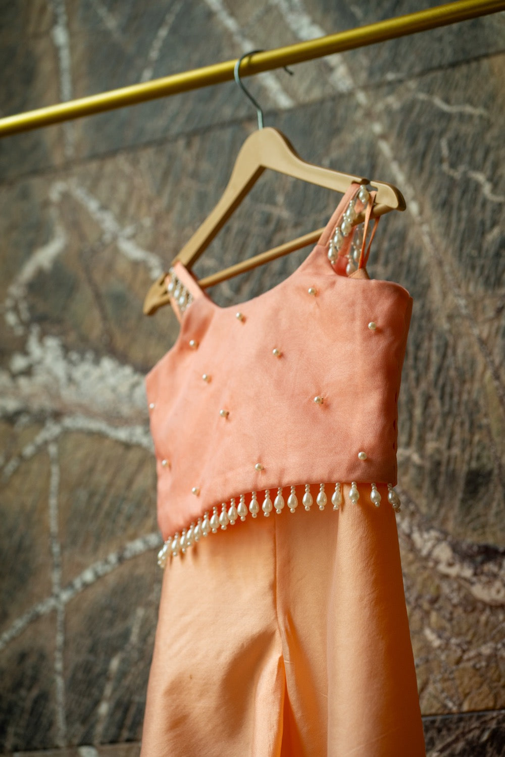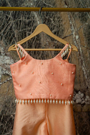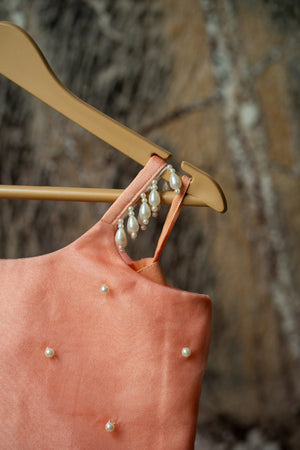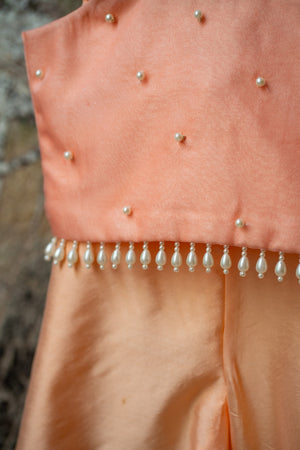 Understated luxury—silk co‑ord adorned with delicate pearl details for an elegant festive look.