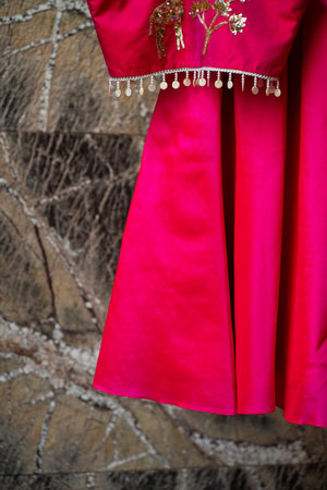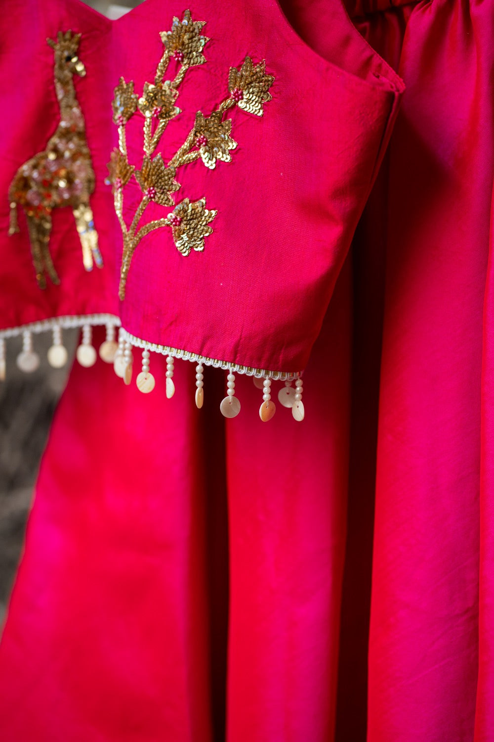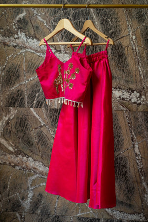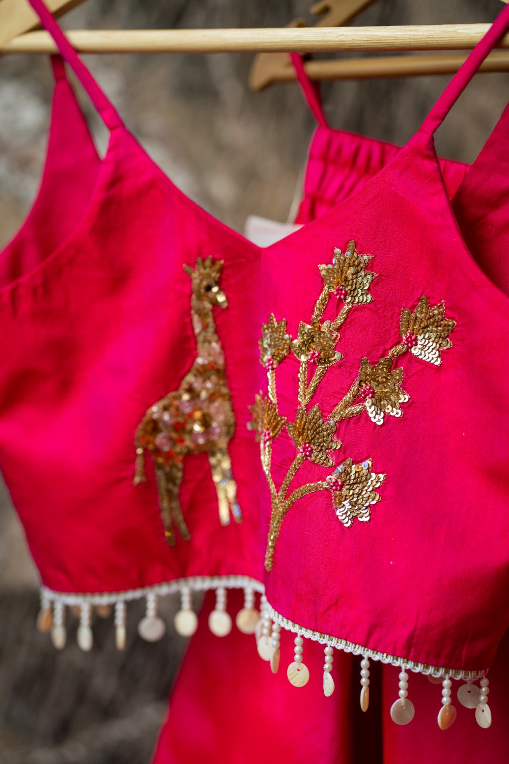 A charming silk set with hand‑embroidered giraffe motif—whimsical detail meets elevated tailoring.
