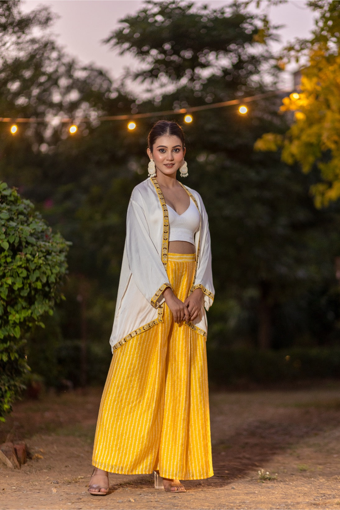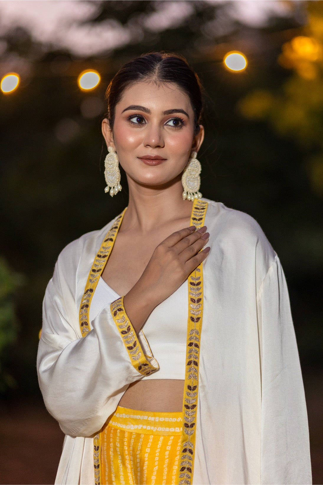 A textural dialogue—bandhani chanderi pants paired with a tailored modal‑satin jacket.