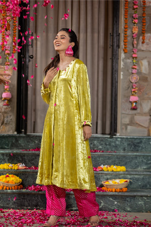 An opulent pairing—plush velvet top matched with Banarasi silk pants for evening grandeur.