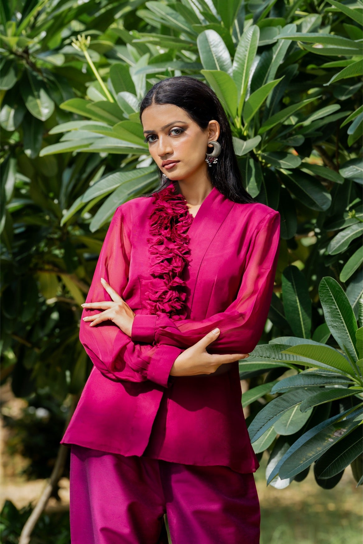 Sheer organza shirt meets tailored cotton‑silk pants—romantic textures with contemporary lines.