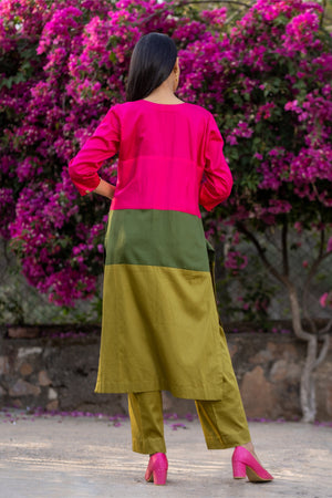 Architectural panels in contrasting hues refresh a classic kurta silhouette in breathable glaze cotton.