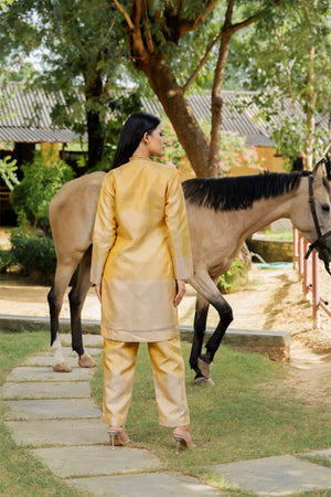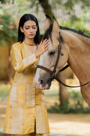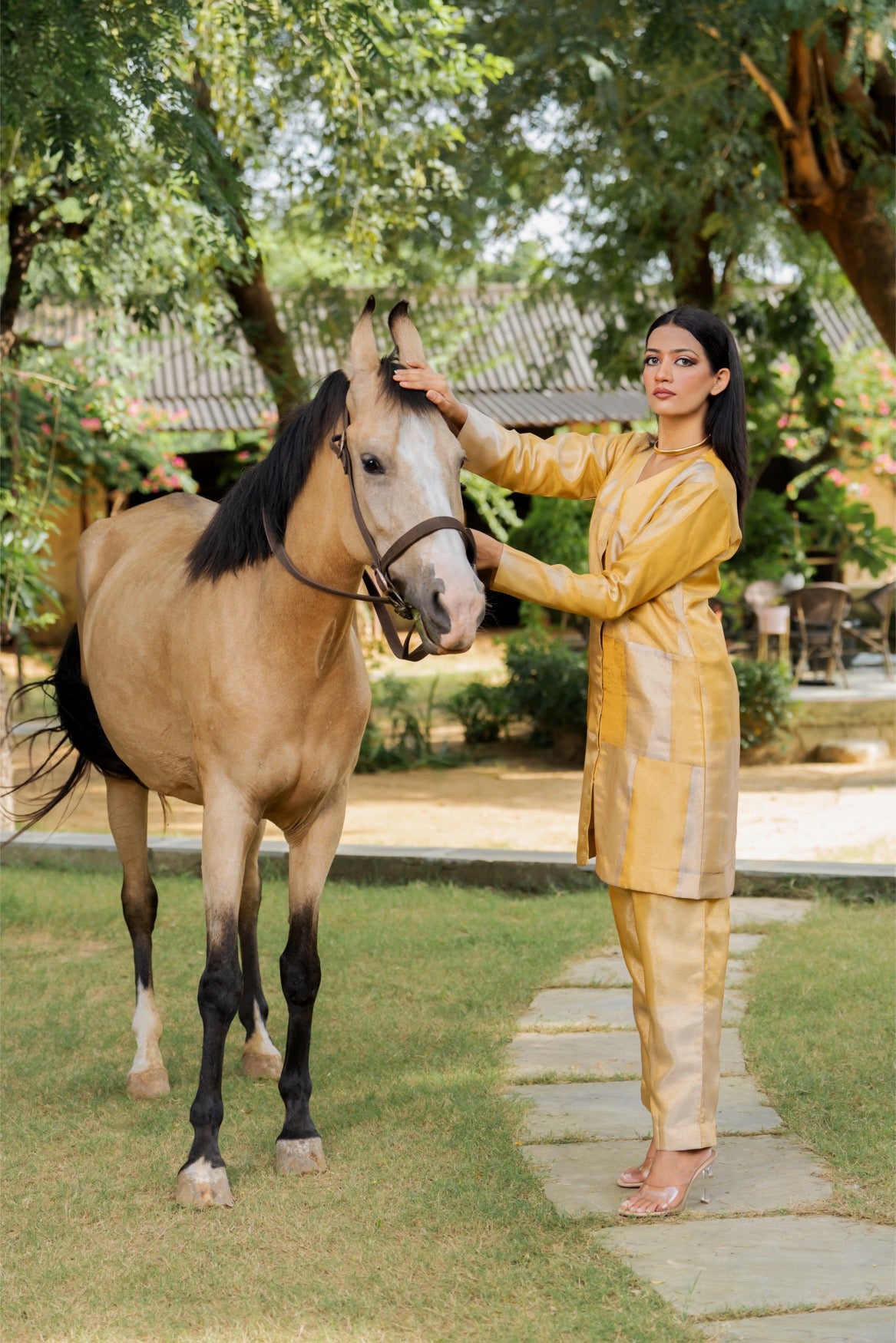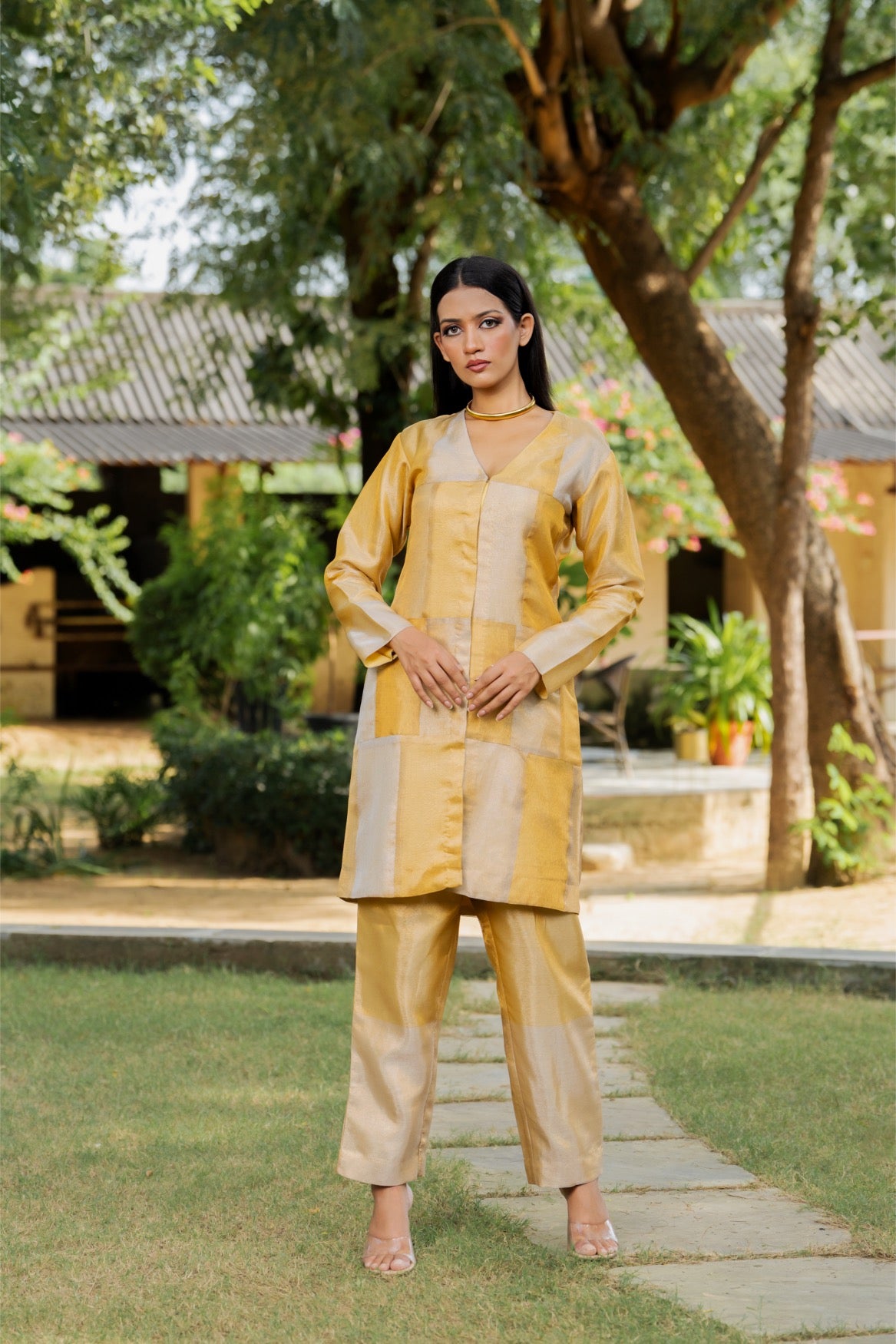 A luminous tissue co‑ord with liquid sheen and soft structure—effortlessly dressy with minimal accessories.